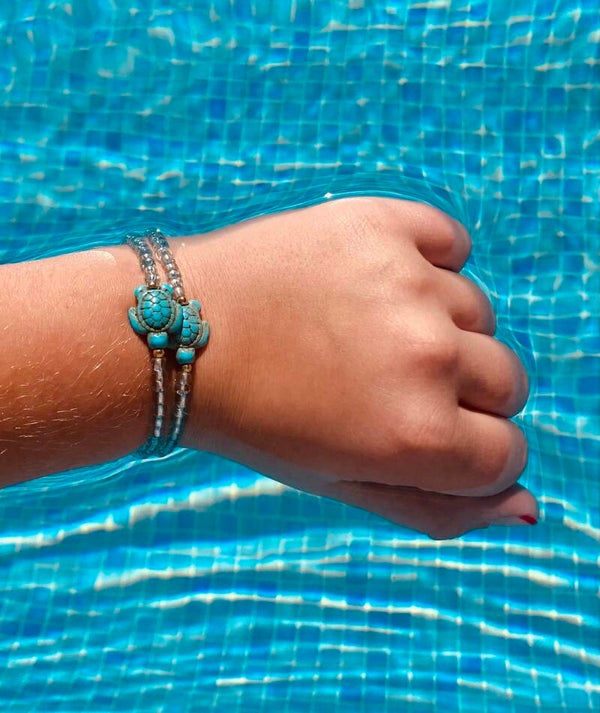 The blue turtle bracelet is a simple but elegant bracelet with light blue beads and a turquoise turtle charm!