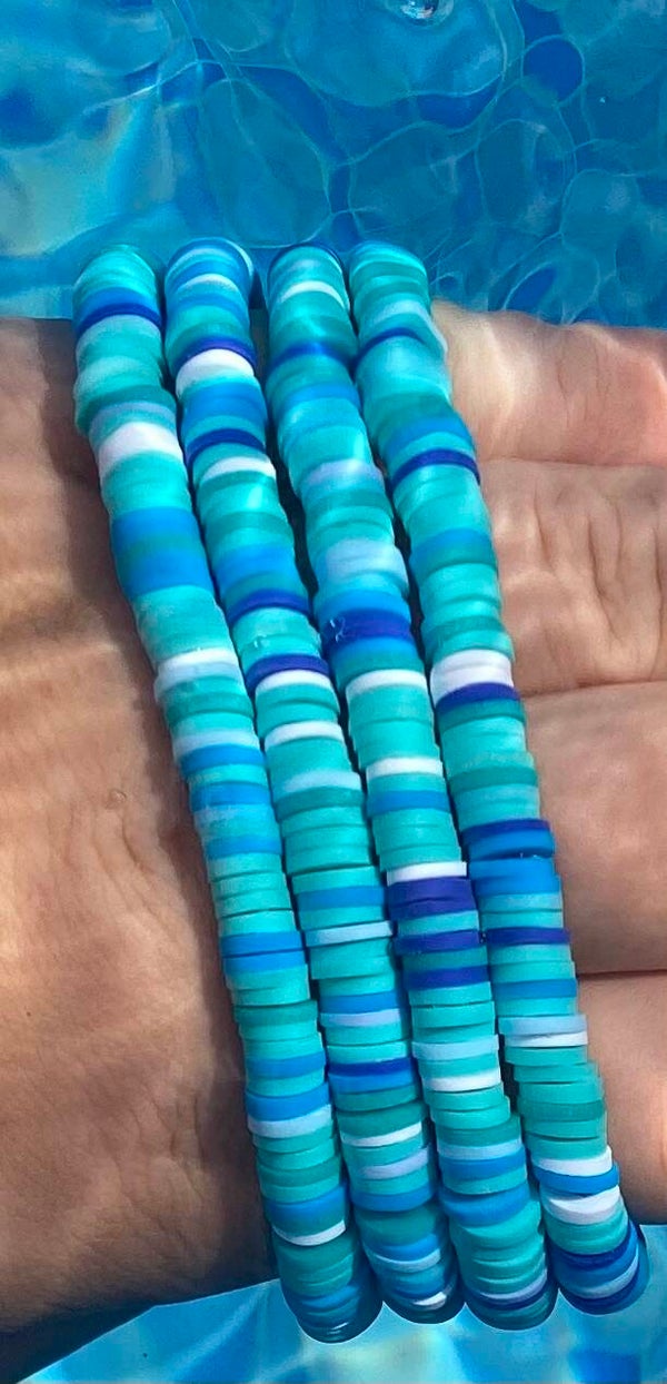 The under da sea clay bead bracelet is a bracelet with different shades of blue and a stretchy elastic perfect for a ocean touch for swimming or a day out!